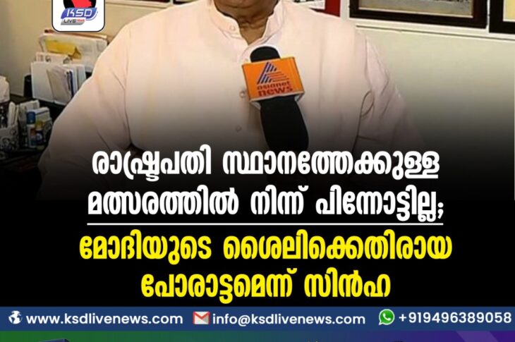 ദേശീയം ‘രാഷ്ട്രപതി സ്ഥാനത്തേക്കുള്ള മത്സരത്തില് നിന്ന് പിന്നോട്ടില്ല’; മോദിയുടെ ശൈലിക്കെതിരായ പോരാട്ടമെന്ന് സിന്ഹJune 25, 2022