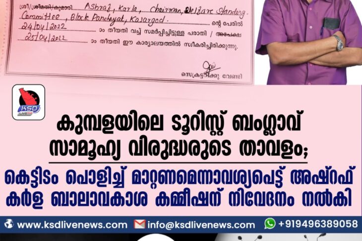 പ്രാദേശികം കുമ്പളയിലെ ടൂറിസ്റ്റ് ബംഗ്ലാവ് സാമൂഹ്യ വിരുദ്ധരുടെ താവളം; കെട്ടിടം പൊളിച്ച് മാറ്റണമെന്നാവശ്യപെട്ട് അഷ്റഫ് കർളബാലാവകാശ കമ്മീഷന് നിവേദനം നൽകിApril 25, 2022