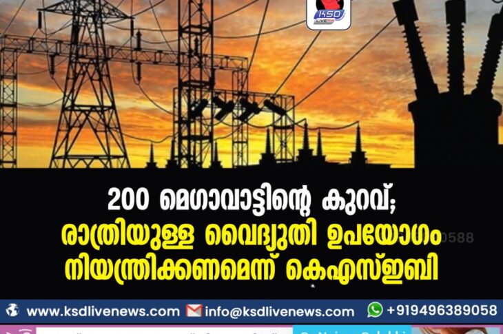 കേരളം 200 മെഗാവാട്ടിന്റെ കുറവ്; രാത്രിയുള്ള വൈദ്യുതി ഉപയോഗം നിയന്ത്രിക്കണമെന്ന് കെഎസ്ഇബിSeptember 25, 2021