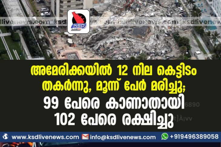 വിദേശം അമേരിക്കയില് 12 നില കെട്ടിടം തകര്ന്നു, മൂന്ന് പേര് മരിച്ചു; 99 പേരെ കാണാതായി, 102 പേരെ രക്ഷിച്ചുJune 25, 2021