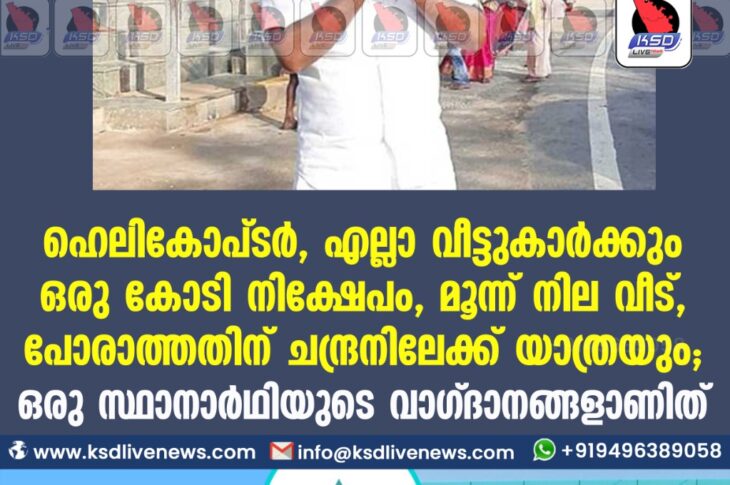 ദേശീയം ഹെലികോപ്ടര്, എല്ലാ വീട്ടുകാര്ക്കും ഒരു കോടി നിക്ഷേപം, മൂന്ന് നില വീട്, പോരാത്തതിന് ചന്ദ്രനിലേക്ക് യാത്രയും; ഒരു സ്ഥാനാര്ഥിയുടെ വാഗ്ദാനങ്ങളാണിത്March 25, 2021