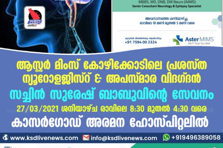 കാസർഗോഡ് ആസ്റ്റർ മിംസ് കോഴിക്കോടിലെ പ്രശസ്ത ന്യൂറോളജിസ്റ് & അപസ്മാര വിദഗ്ദൻ സച്ചിൻ സുരേഷ് ബാബുവിന്റെ സേവനം 27/03/2021 ശനിയാഴ്ച രാവിലെ 8:30 മുതൽ 4.30 വരെ, കാസർഗോഡ് അരമന ഹോസ്പിറ്റലിൽMarch 25, 2021