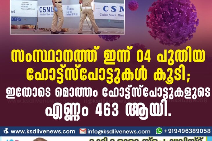 കേരളംകോവിഡ് 19 സംസ്ഥാനത്ത് ഇന്ന് 04 പുതിയ ഹോട്ട്സ്പോട്ടുകള് കൂടി; ഇതോടെ മൊത്തം ഹോട്ട്സ്പോട്ടുകളുടെ എണ്ണം 463 ആയി.December 25, 2020