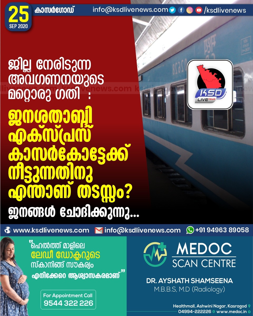 പ്രാദേശികം ജില്ല നേരിടുന്ന അവഗണനയുടെ മറ്റൊരു ഗതി :ജനശതാബ്ദി എക്സ്പ്രസ് കാസർകോട്ടേക്ക് നീട്ടുന്നതിനു എന്താണ് തടസ്സം?–ജനങ്ങൾ ചോദിക്കുന്നു…..September 25, 2020