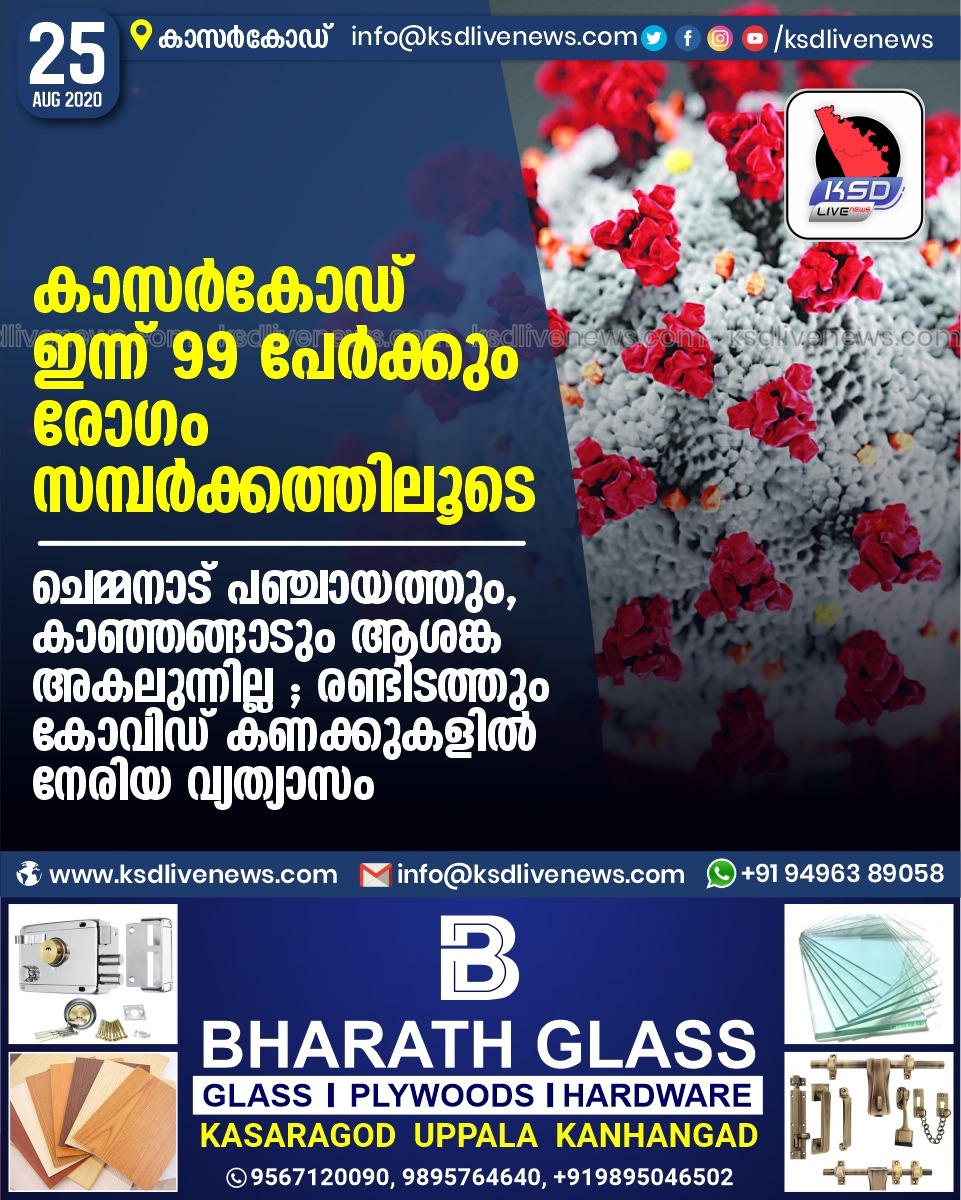 പ്രാദേശികം കാസർകോഡ് ഇന്ന് 99 പേർക്കും രോഗം സമ്പർക്കത്തിലൂടെ ; ചെമ്മനാട് പഞ്ചായത്തും, കാഞ്ഞങ്ങാടും ആശങ്ക അകലുന്നില്ല ; രണ്ടിടത്തും കോവിഡ് കണക്കുകളിൽ നേരിയ വ്യത്യാസംAugust 25, 2020