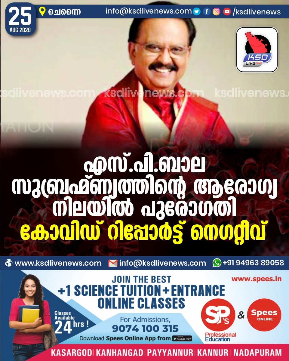 ദേശീയം എസ്.പി.ബാല സുബ്രഹ്മണ്യത്തിന്റെ ആരോഗ്യ നിലയിൽ പുരോഗതി ;കോവിഡ് റിപ്പോർട്ട് നെഗറ്റീവ്August 25, 2020