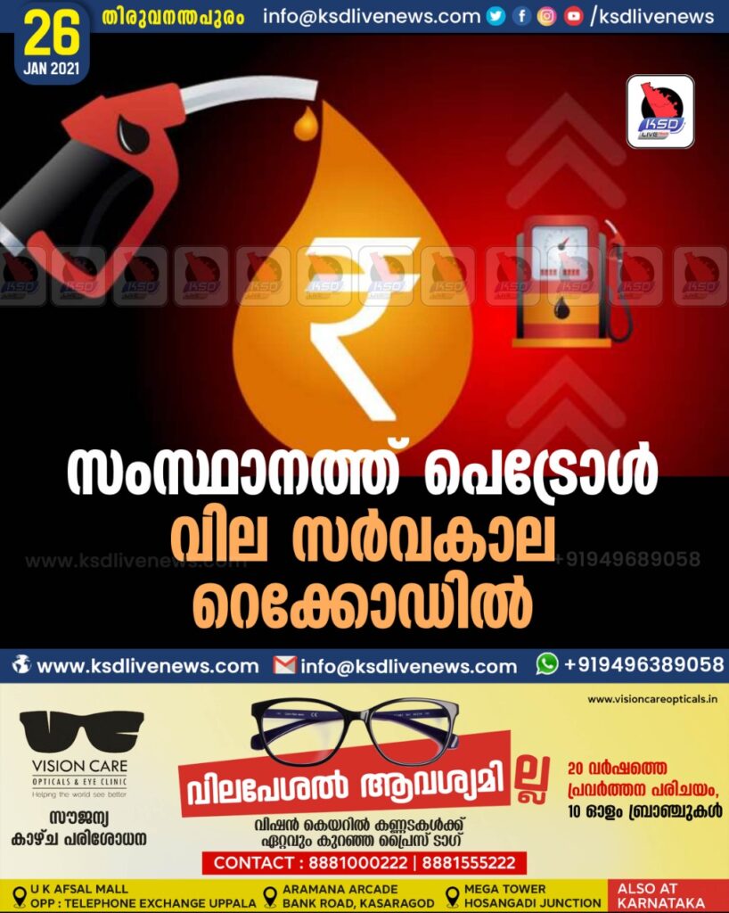 സംസ്ഥാനത്ത് പെട്രോൾ വില സർവകാല റെക്കോഡിൽ