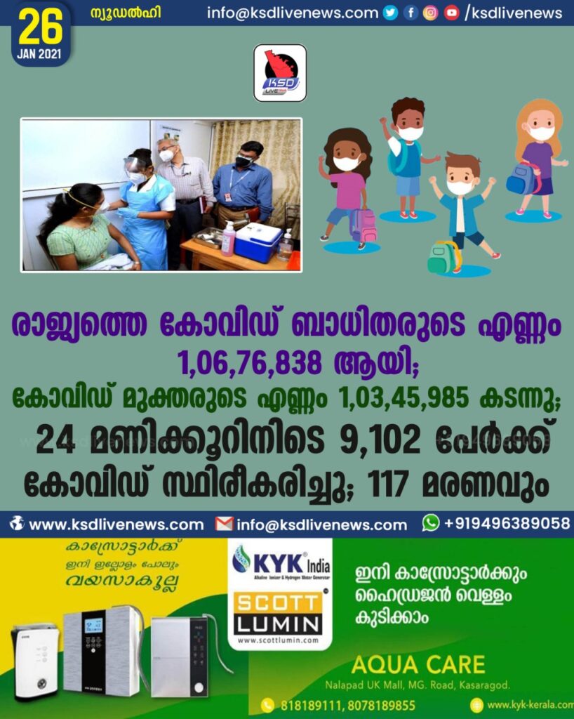 രാജ്യത്തെ കോവിഡ് ബാധിതരുടെ എണ്ണം 1,06,76,838 ആയി ; കോവിഡ് മുക്തരുടെ എണ്ണം 1,03,45,985 കടന്നു ;
