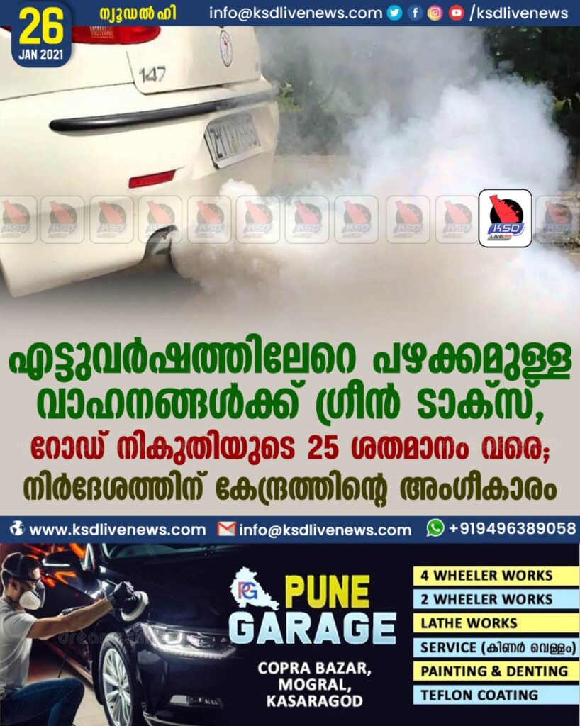 എട്ടുവർഷത്തിലേറെ പഴക്കമുള്ള വാഹനങ്ങൾക്ക് ഗ്രീൻ ടാക്സ് , റോഡ് നികുതിയുടെ 25 ശതമാനം വരെ ; നിർദേശത്തിന് കേന്ദ്രത്തിന്റെ അംഗീകാരം