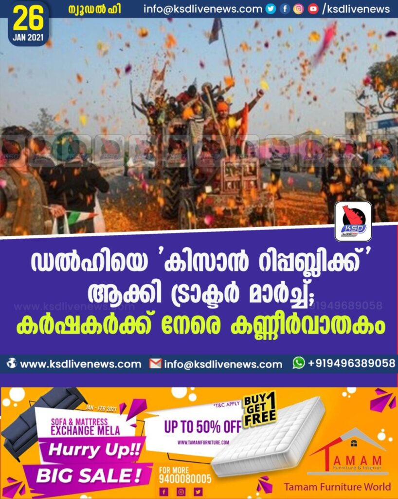 ഡല്ഹിയെ ‘കിസാന് റിപ്പബ്ലിക്ക്’ ആക്കി ട്രാക്ടര് മാര്ച്ച്; കര്ഷകര്ക്ക് നേരെ കണ്ണീര്വാതകം