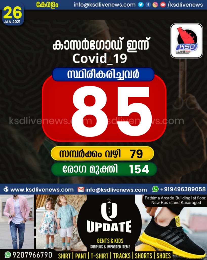 കാസര്കോട് ജില്ലയില് 85 പേര്ക്ക് കോവിഡ്, 154 പേര്ക്ക് രോഗമുക്തി