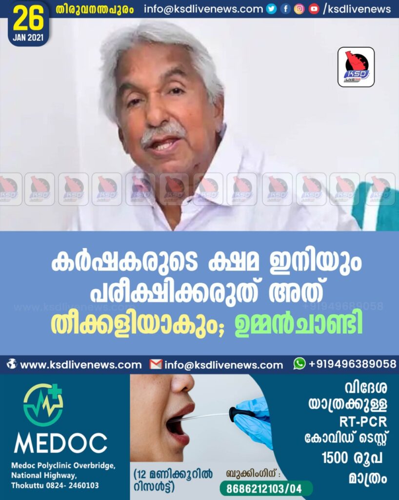 കർഷകരുടെ ക്ഷമ ഇനിയും പരീക്ഷിക്കരുത് അത് തീക്കളിയാകും ; ഉമ്മൻചാണ്ടി