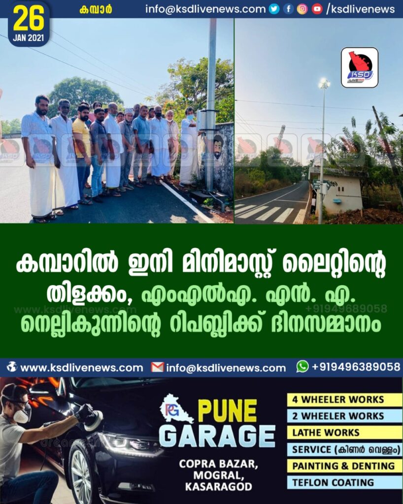 കമ്പാർ: എം.എൽ .എ. ആസ്തിവികസനഫണ്ടിൽ ഉൾപ്പെടുത്തി കമ്പാർ ജംഗ്ഷൻ, ബെദ്രഡുക്ക ജംഗ്ഷൻ, എന്നിവിടങ്ങളിൽ, മിനിമാസ്റ്റ് ലൈറ്റ് സ്വിച്ച് ഓൺ കർമ്മം എം.എൽ. എ. എൻ. എ. നെല്ലിക്കുന്ന് നിർവഹിച്ചു , ഗ്രാമപഞ്ചായത്ത് വൈസ് : പ്രസിഡണ്ട് മുജീബ് കമ്പാർ , കെ.ബി.കുഞ്ഞാമു, എസ്.പി. സലാഹുദീൻ , കെ.എ. അബ്ദുല്ല കുഞ്ഞി, ജമാൽ ഹുസൈൻ, പിഎം കബീർ , ഹാരിസ് കമ്പാർ , ബഷീർ പാൽത്താട്ടി , എം.എ. നജീബ്, ഖലീൽസിലോൻ, ഇർഫാൻ കുന്നിൽ , ഷാഫി തായൽ , മുഹമ്മദലി കമ്പാർ , അർഷാദ്, സാദിഖ് നാട്ടകല്ല് , അഷ്റഫ് ദേശാംകുളം ,തുടങ്ങിയവർ സംബന്ധിച്ചു
