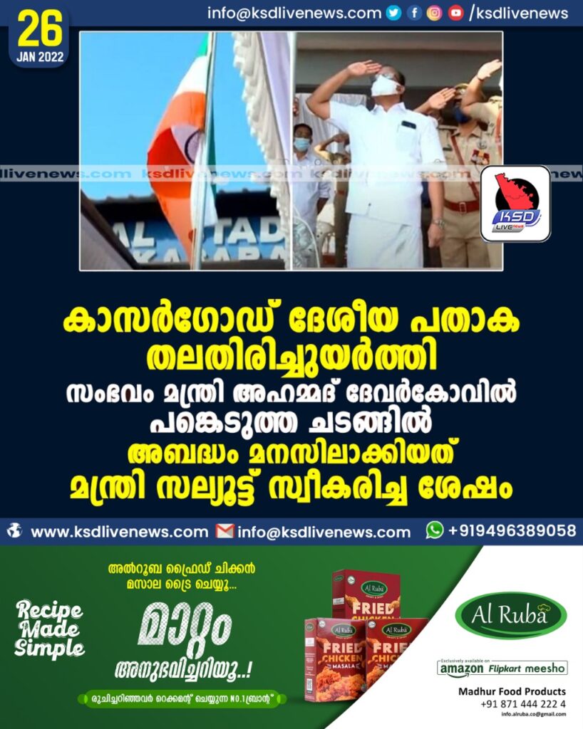 കാസർഗോഡ് ദേശീയ പതാക തലതിരിച്ചുയര്ത്തി; സംഭവം മന്ത്രി അഹമ്മദ് ദേവര്കോവില് പങ്കെടുത്ത ചടങ്ങില്, അബദ്ധം മനസിലാക്കിയത് മന്ത്രി സല്യൂട്ട് സ്വീകരിച്ച ശേഷം