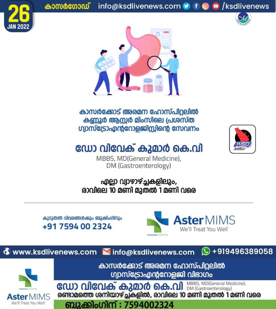 ആസ്റർ മിംസിലെ ഗാസ്ട്രോ എൻട്രോളജി (Gastro)വിഭാഗം കാസറഗോഡ് അരമന ഹോസ്പിറ്റലിൽ എല്ലാ വ്യാഴഴ്ചകളിലും