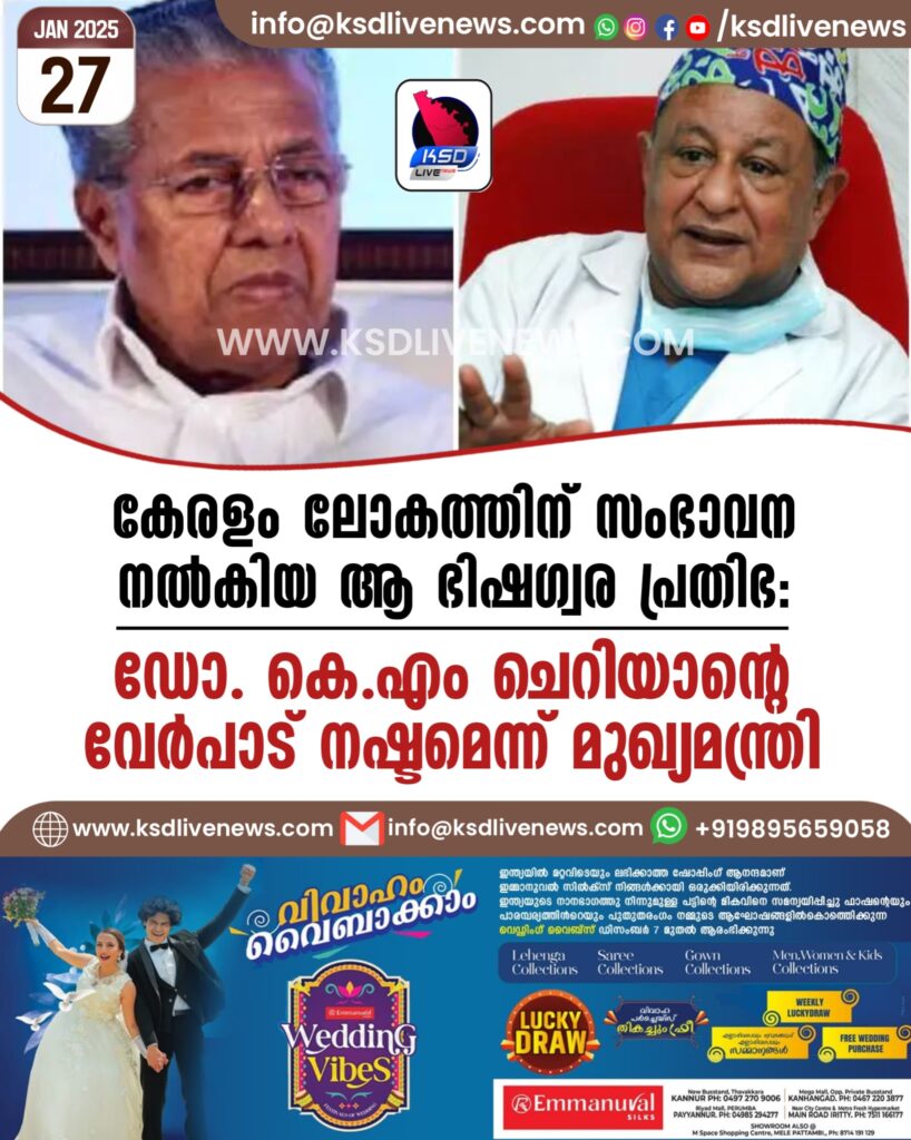 കേരളം ലോകത്തിന് സംഭാവന നല്കിയ ആ ഭിഷഗ്വര പ്രതിഭ: ഡോ. കെ എം ചെറിയാന്റെ വേര്പാട് നഷ്ടമെന്ന് മുഖ്യമന്ത്രി