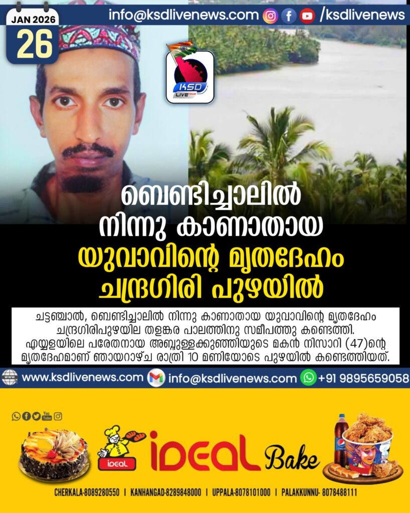 ബെണ്ടിച്ചാലില് നിന്നു കാണാതായ യുവാവിന്റെ മൃതദേഹം ചന്ദ്രഗിരി പുഴയില്