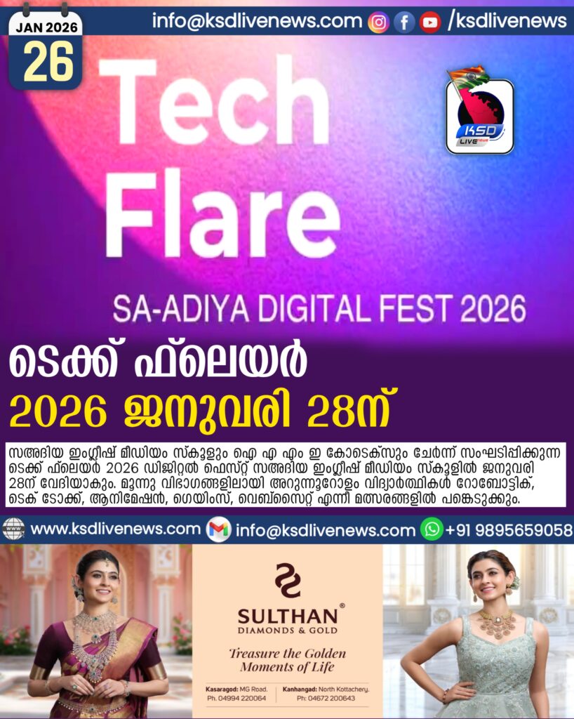 ദേളി: സഅദിയ ഇംഗ്ലീഷ് മീഡിയം സ്കൂളും ഐ എ എം ഇ കോടെക്സും ചേർന്ന് സംഘടിപ്പിക്കുന്ന ടെക്ക് ഫ്ലെയർ 2026 ഡിജിറ്റൽ ഫെസ്റ്റ് സഅദിയ ഇംഗ്ലീഷ് മീഡിയം സ്കൂളിൽ ജനുവരി 28 ന് വേദിയാകും. മൂന്നു വിഭാഗങ്ങളിലായി അറുന്നൂറോളം വിദ്യാർത്ഥികൾ റോബോട്ടിക്, ടെക് ടോക്ക്, ആനിമേഷൻ, ഗെയിംസ്, വെബ്സൈറ്റ് എന്നീ മത്സരങ്ങളിൽ പങ്കെടുക്കും.