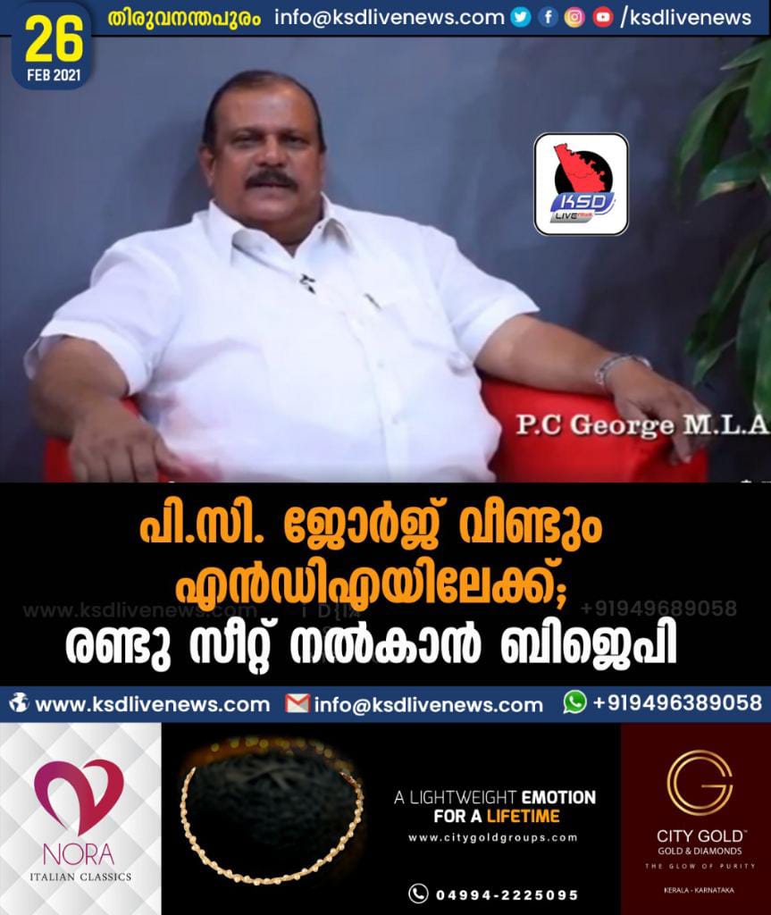 പി.സി. ജോര്ജ് വീണ്ടും എന്ഡിഎയിലേക്ക്; രണ്ടു സീറ്റ് നല്കാന് ബിജെപി