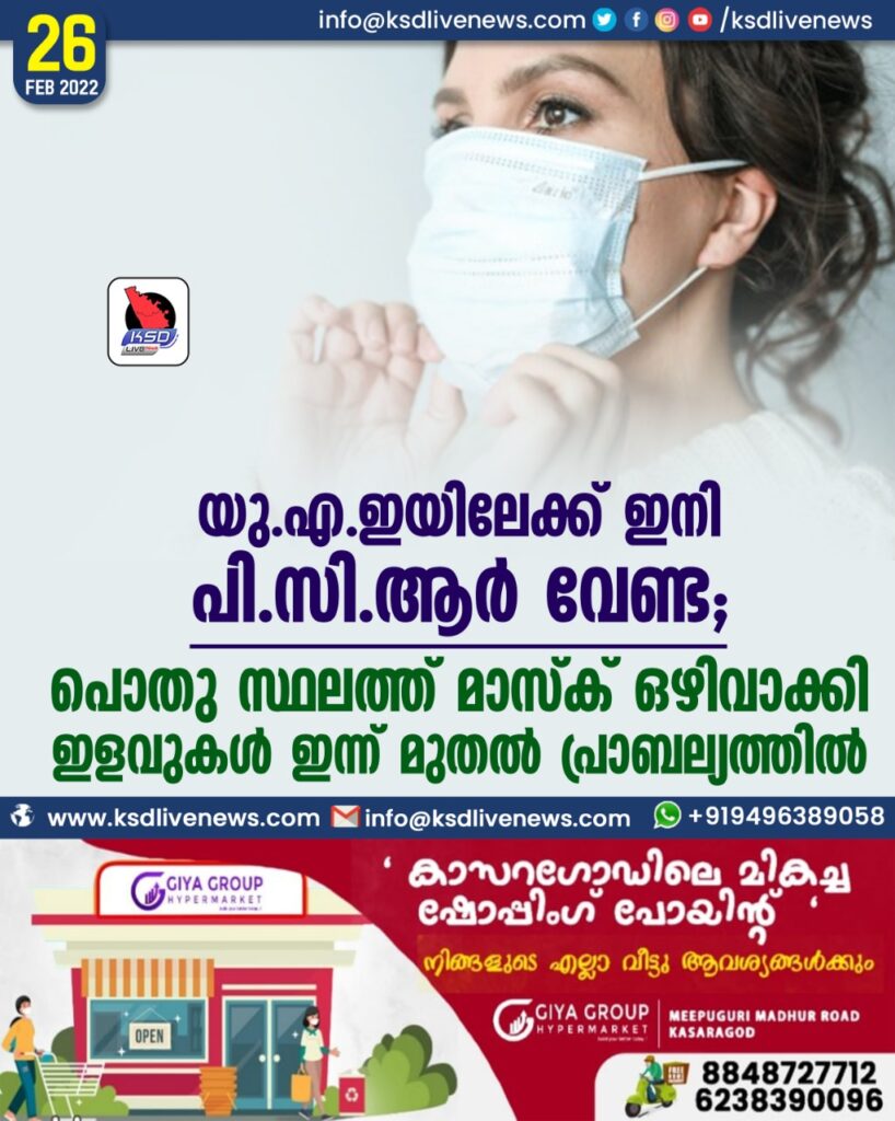 യു എ ഇയിലേക്ക് ഇനി പി സി ആര് വേണ്ട; പൊതുസ്ഥലത്ത് മാസ്ക് ഒഴിവാക്കി ഇളവുകള് ഇന്ന് മുതല് പ്രാബല്യത്തില്