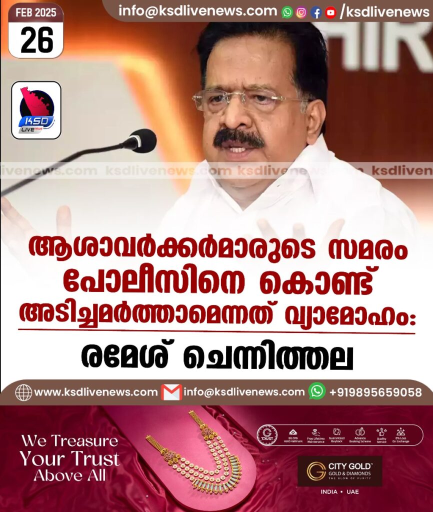 ആശാവർക്കർമാരുടെ സമരം പോലീസിനെ കൊണ്ട് അടിച്ചമർത്താമെന്നത് വ്യാമോഹം: രമേശ് ചെന്നിത്തല