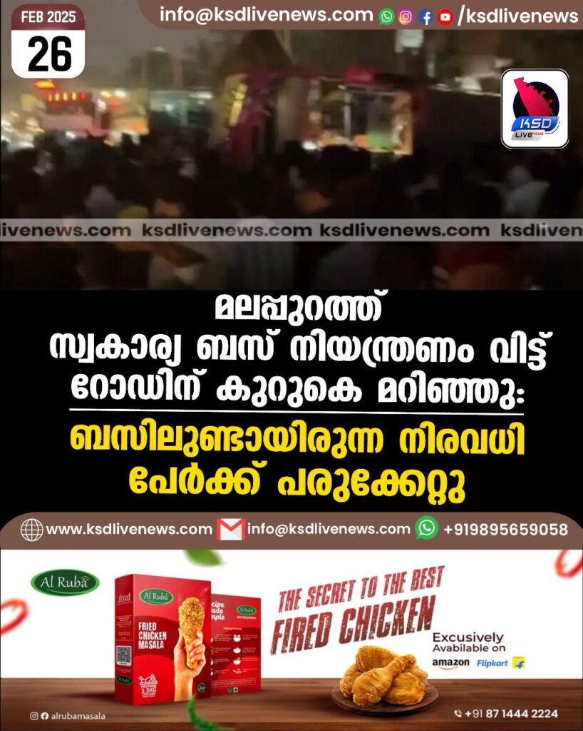 മലപ്പുറത്ത് സ്വകാര്യ ബസ് നിയന്ത്രണം വിട്ട് റോഡിന് കുറുകെ മറിഞ്ഞു; ബസിലുണ്ടായിരുന്ന നിരവധി പേര്ക്ക് പരുക്കേറ്റു