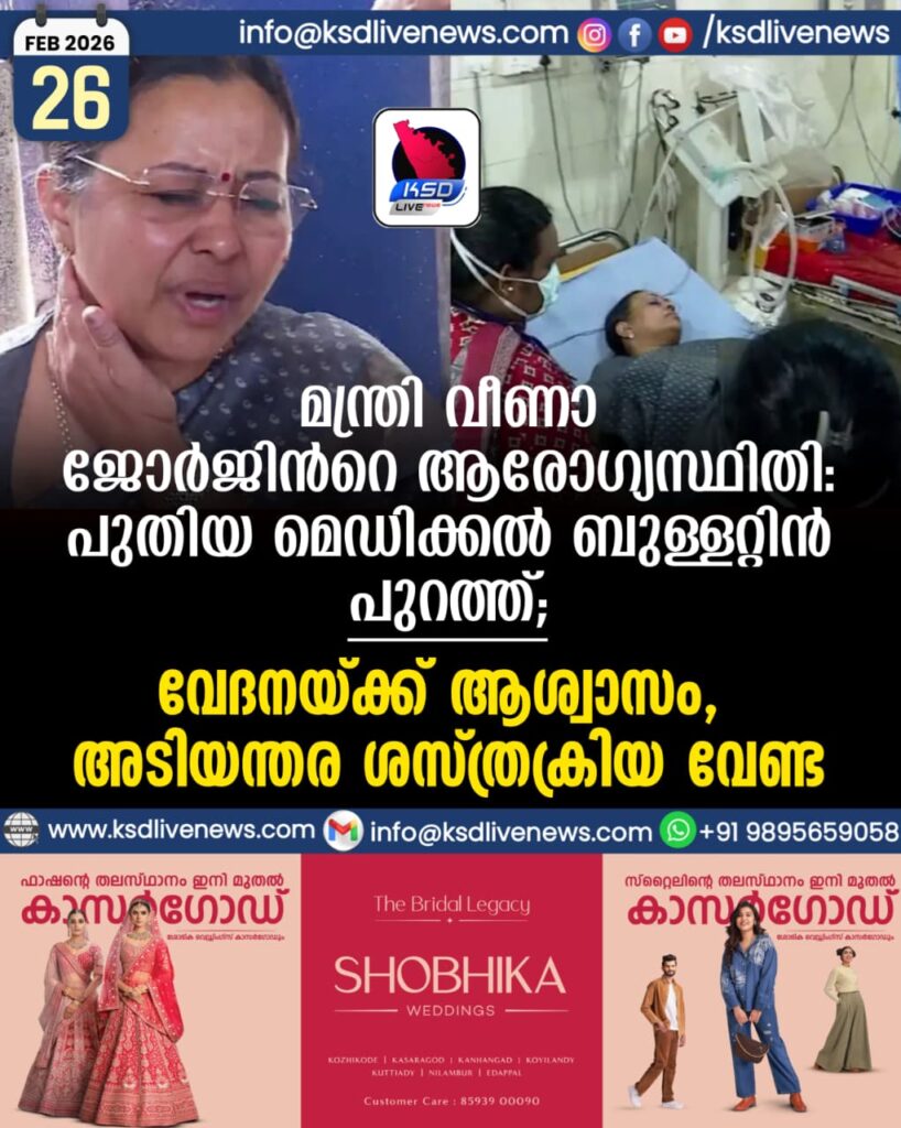 മന്ത്രി വീണാ ജോര്‍ജിന്‍റെ ആരോഗ്യസ്ഥിതി; പുതിയ മെഡിക്കല്‍ ബുള്ളറ്റിൻ പുറത്ത്, ‘വേദനയ്ക്ക് ആശ്വാസം, അടിയന്തര ശസ്ത്രക്രിയ വേണ്ട’