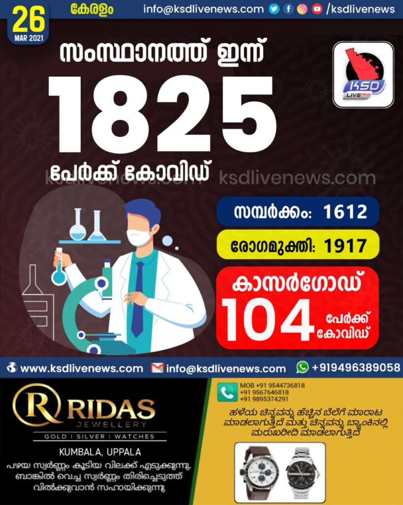 സംസ്ഥാനത്ത് ഇന്ന് 1825 പേർക്ക് കോവിഡ് സ്ഥിരീകരിച്ചു. സമ്പർക്കം വഴി 1612 പേർക്കും ; ആശ്വാസമായി 1917 പേർക്ക് രോഗ മുക്തിയും ; കാസർഗോഡ് ജില്ലയിൽ 104 പേർക്ക് പുതിയ കോവിഡ് കേസുകൾ ; മരണം 14
