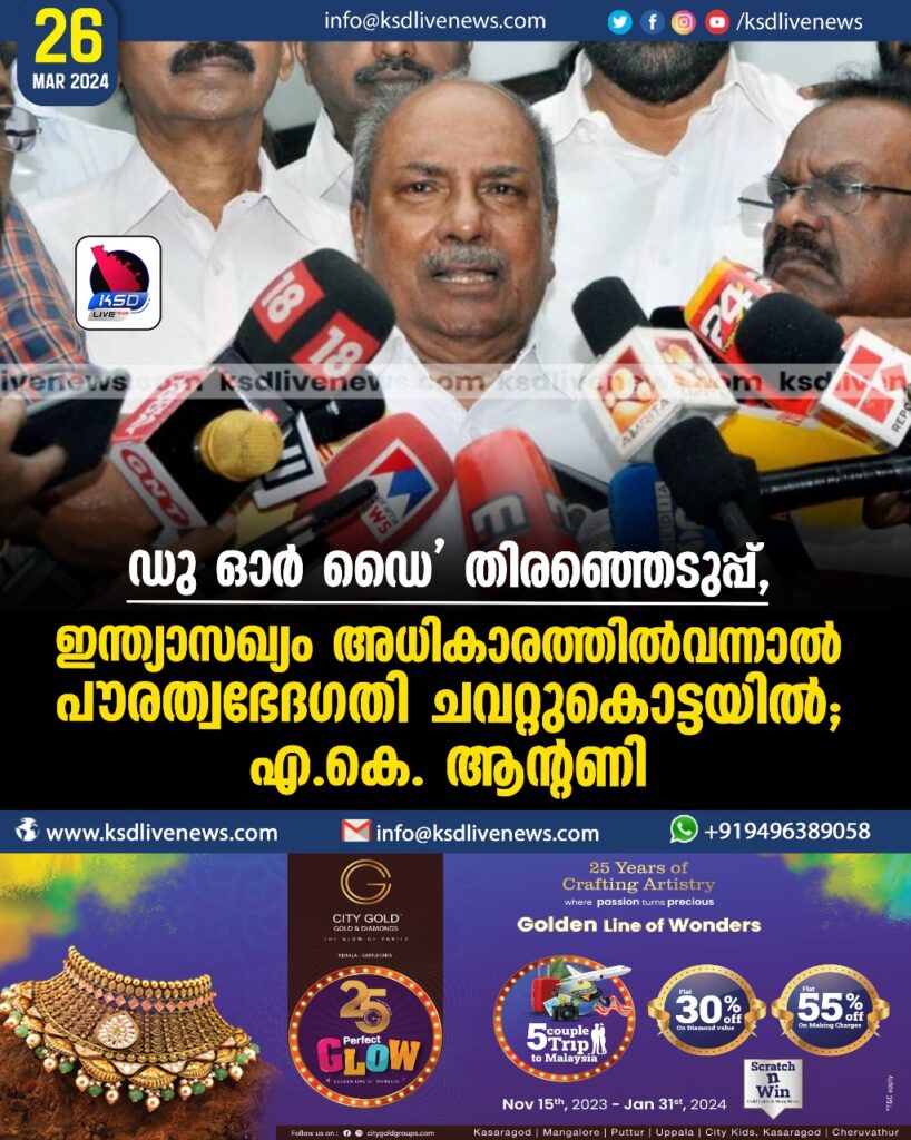 ‘ഡു ഓർ ഡൈ’ തിരഞ്ഞെടുപ്പ്, ഇന്ത്യാസഖ്യം അധികാരത്തിൽവന്നാൽ പൗരത്വഭേദഗതി ചവറ്റുകൊട്ടയിൽ: എ.കെ. ആന്റണി