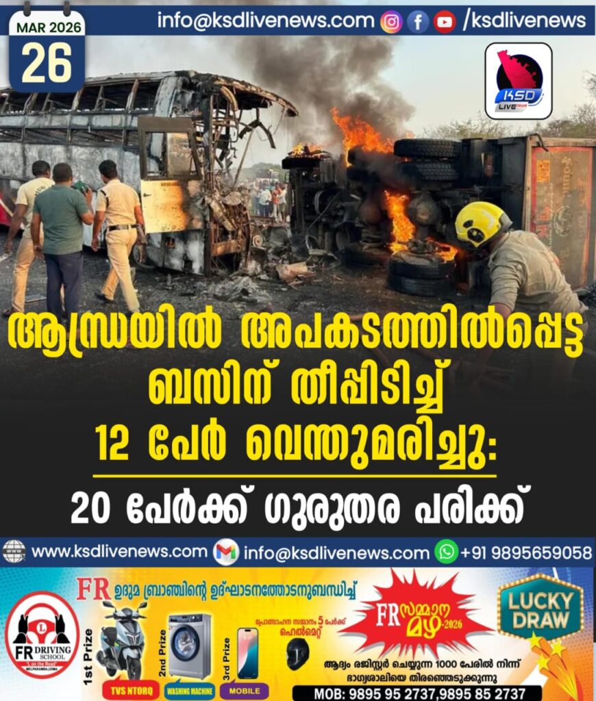 ആന്ധ്രയിൽ അപകടത്തിൽപ്പെട്ട ബസിന് തീപ്പിടിച്ച് 12 പേർ വെന്തുമരിച്ചു; 20 പേർക്ക് ഗുരുതര പരിക്ക്