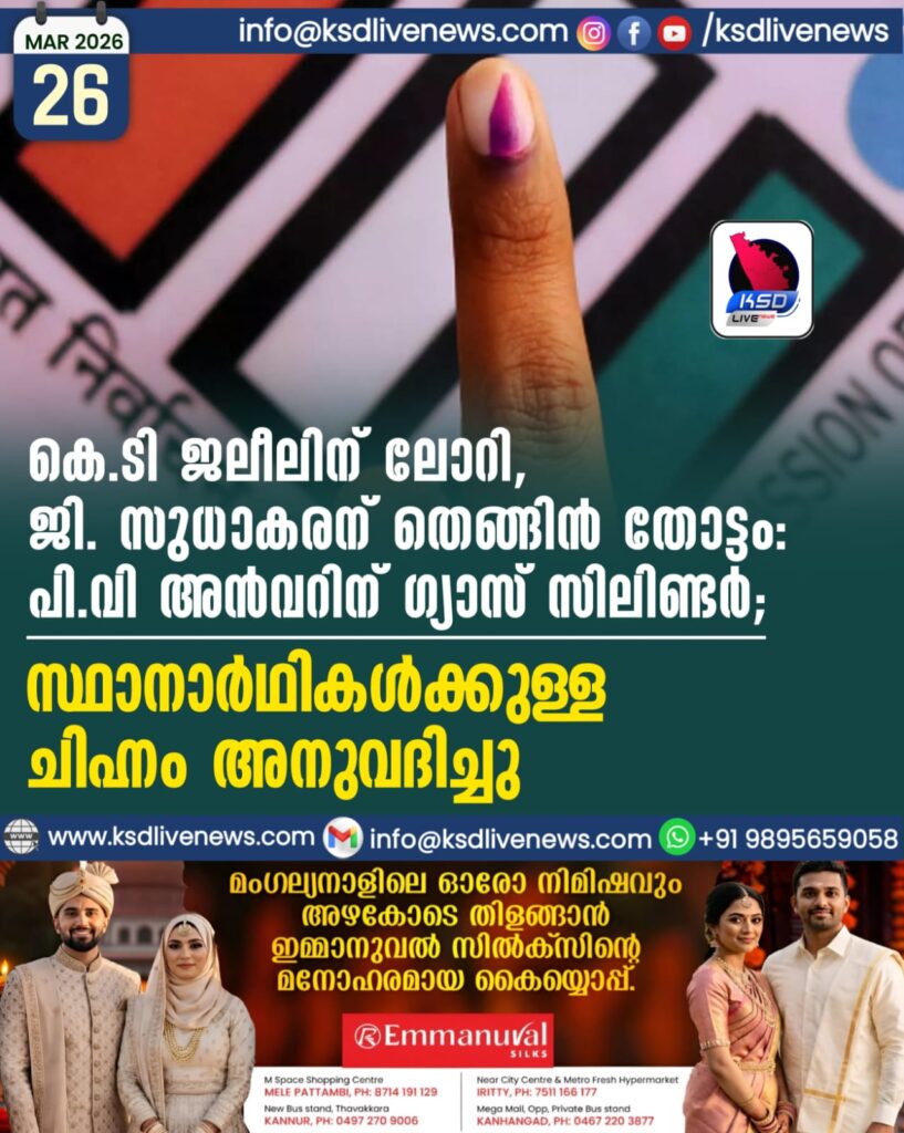 കെ.ടി ജലീലിന് ലോറി, ജി. സുധാകരന് തെങ്ങിൻ തോട്ടം, പി.വി അൻവറിന് ഗ്യാസ് സിലിണ്ടർ; സ്ഥാനാര്ഥികള്ക്കുള്ള ചിഹ്നം അനുവദിച്ചു