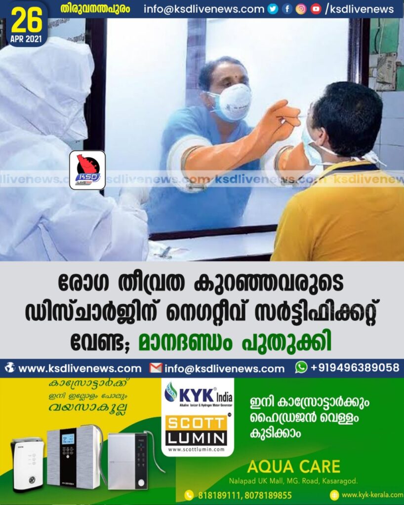രോഗതീവ്രത കുറഞ്ഞവരുടെ ഡിസ്ചാര്ജിന് നെഗറ്റീവ് സര്ട്ടിഫിക്കറ്റ് വേണ്ട; മാനദണ്ഡം പുതുക്കി