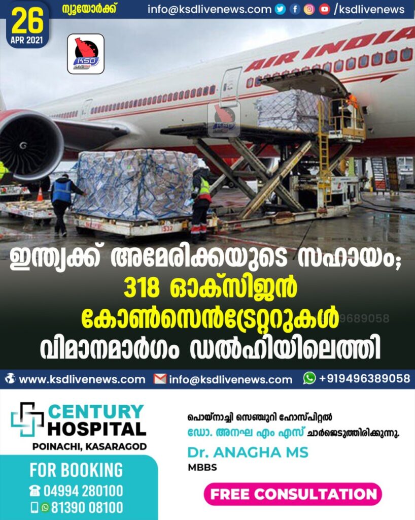ഇന്ത്യക്ക് അമേരിക്കയുടെ സഹായം; 318 ഒാക്സിജന്‍ കോണ്‍സെന്‍ട്രേറ്ററുകള്‍ വിമാനമാര്‍ഗം ഡല്‍ഹിയിലെത്തി