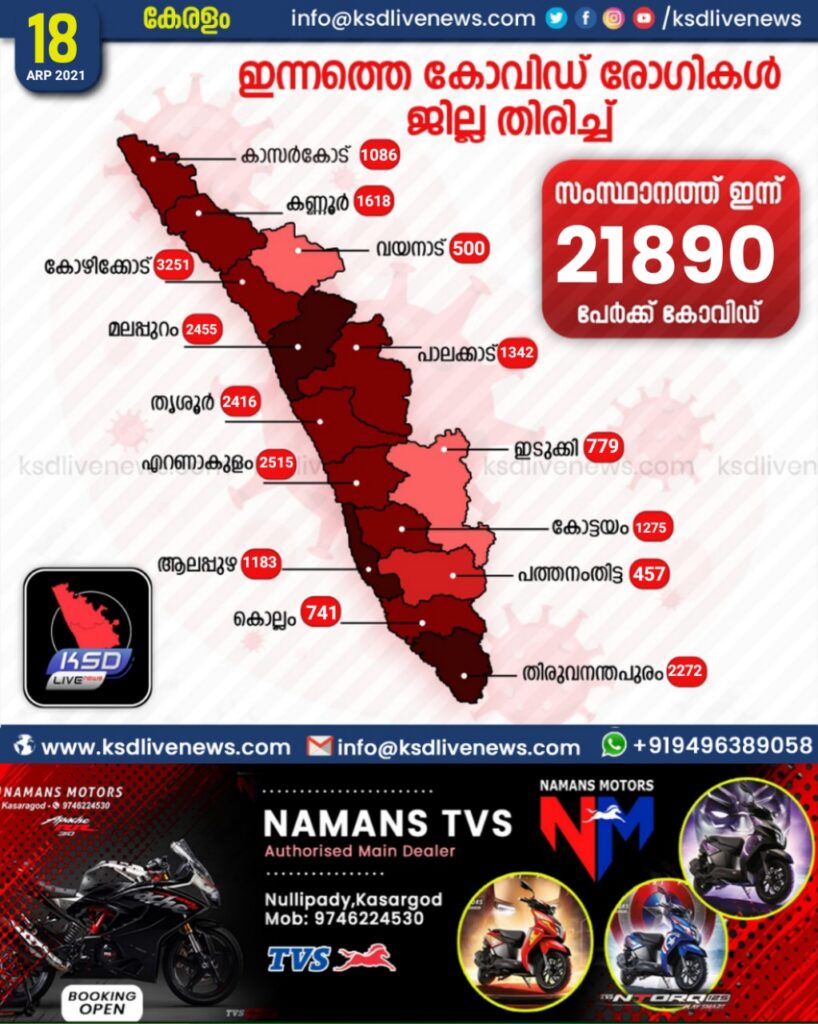കേരളത്തില്‍ ഇന്ന് 21,890 പേര്‍ക്ക് കോവിഡ്-19 സ്ഥിരീകരിച്ചു. കോഴിക്കോട് 3251, എറണാകുളം 2515, മലപ്പുറം 2455, തൃശൂര്‍ 2416, തിരുവനന്തപുരം 2272, കണ്ണൂര്‍ 1618, പാലക്കാട് 1342, കോട്ടയം 1275, ആലപ്പുഴ 1183, കാസര്‍ഗോഡ് 1086, ഇടുക്കി 779, കൊല്ലം 741, വയനാട് 500, പത്തനംതിട്ട 457 എന്നിങ്ങനേയാണ് ജില്ലകളില്‍ ഇന്ന് രോഗ ബാധ സ്ഥിരീകരിച്ചത്