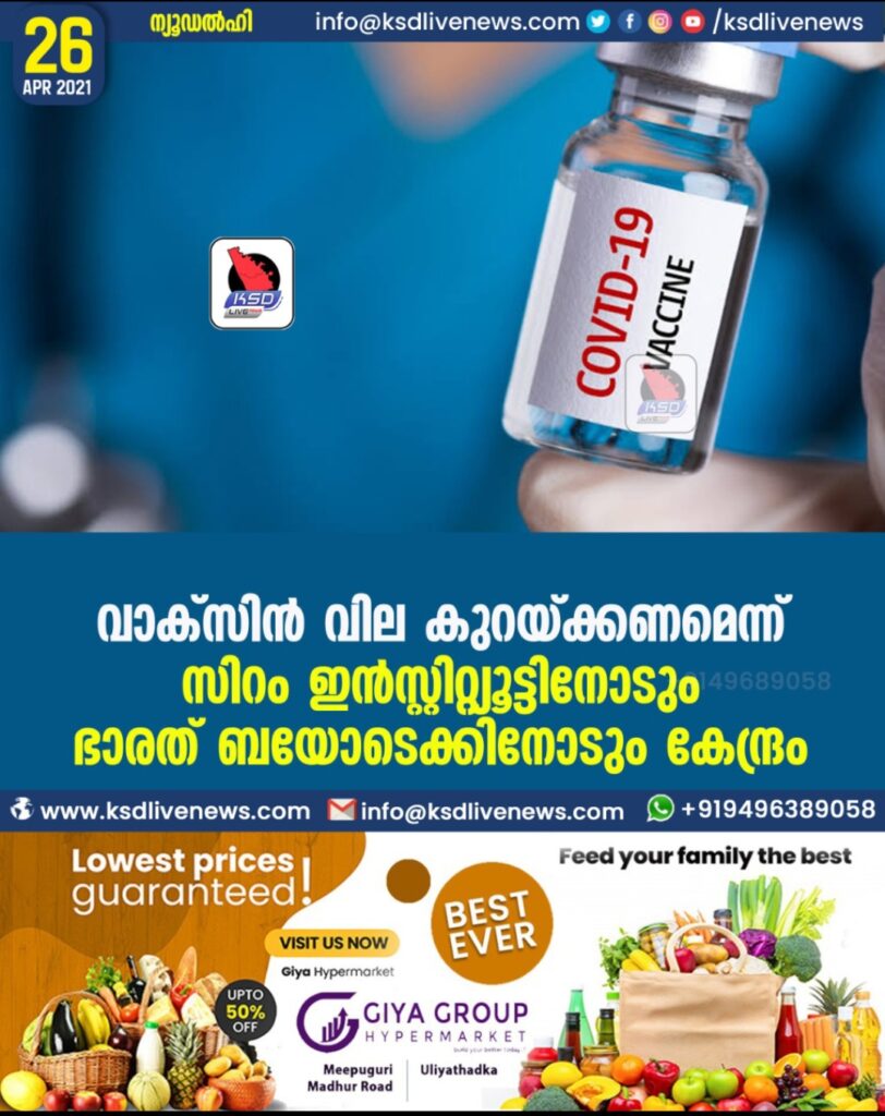 വാക്സിന് വില കുറയ്ക്കണമെന്ന് സിറം ഇന്സ്റ്റിറ്റ്യൂട്ടിനോടും ഭാരത് ബയോടെക്കിനോടും കേന്ദ്രം