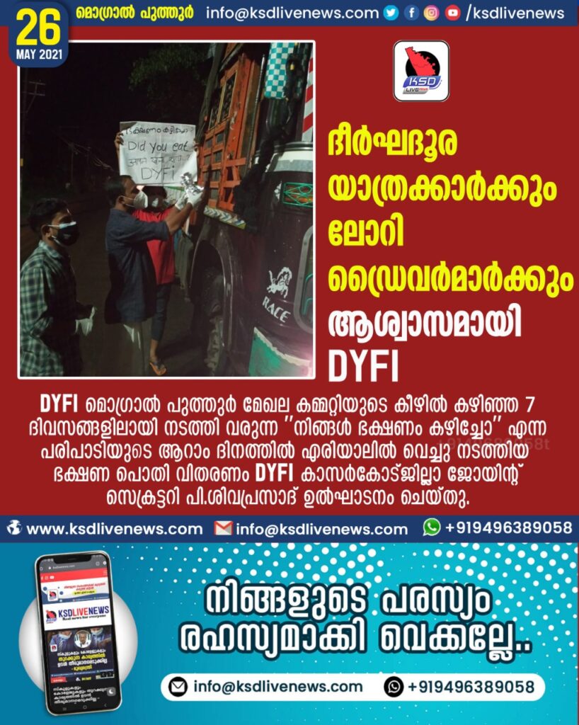 ദീർഘദൂര യാത്രക്കാർക്കും ലോറി ഡ്രൈവർമാർക്കും ആശ്വാസമായി DYFI