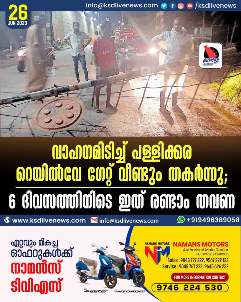 വാഹനമിടിച്ച് പള്ളിക്കര റെയിൽവേ ഗേറ്റ് വീണ്ടും തകർന്നു; 6 ദിവസത്തിനിടെ ഇത് രണ്ടാം തവണ