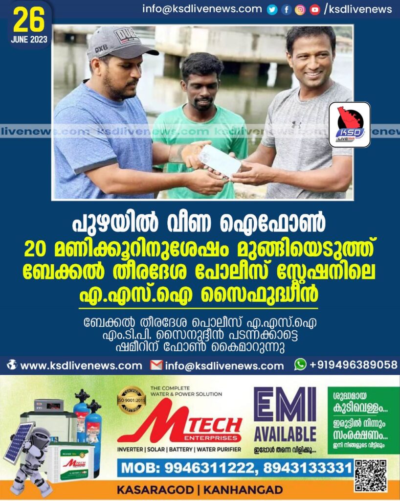 പുഴയിൽ വീണ ഐഫോൺ 20 മണിക്കൂറിനുശേഷം മുങ്ങിയെടുത്ത് ബേക്കൽ തീരദേശ പോലീസ് സ്റ്റേഷനിലെ എ.എസ്.ഐ സൈഫുദ്ധീൻ