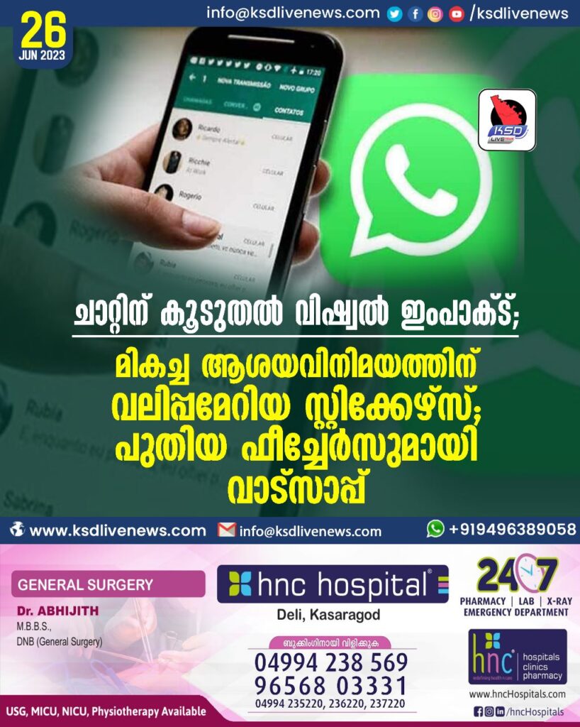 ചാറ്റിന് കൂടുതല് വിഷ്വല് ഇംപാക്ട്; മികച്ച ആശയവിനിമയത്തിന് വലിപ്പമേറിയ സ്റ്റിക്കേഴ്സ്; പുതിയ ഫീച്ചേർസുമായി വാട്സാപ്പ്