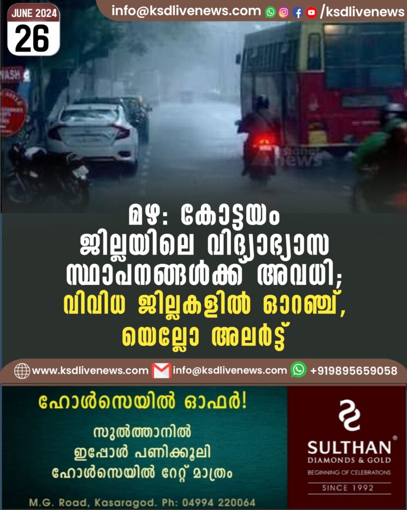 മഴ: കോട്ടയം ജില്ലയിലെ വിദ്യാഭ്യാസ സ്ഥാപനങ്ങള്‍ക്ക് അവധി; വിവിധ ജില്ലകളിൽ ഓറഞ്ച്, യെല്ലോ അലർട്ട്