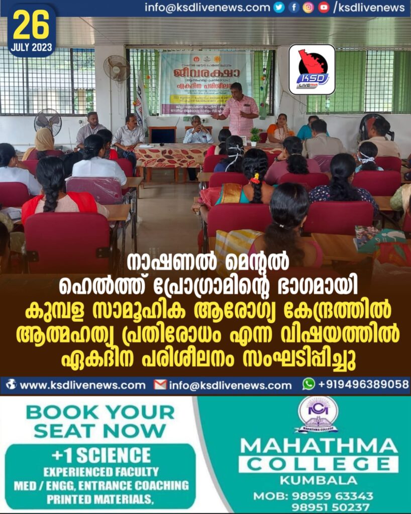 നാഷണൽ മെന്റൽ ഹെൽത്ത് പ്രോഗ്രാമിന്റെ ഭാഗമായി കുമ്പള സാമൂഹിക ആരോഗ്യ കേന്ദ്രത്തിൽ ആത്മഹത്യ പ്രതിരോധം എന്ന വിഷയത്തിൽ ഏകദിന പരിശീലനം സംഘടിപ്പിച്ചു