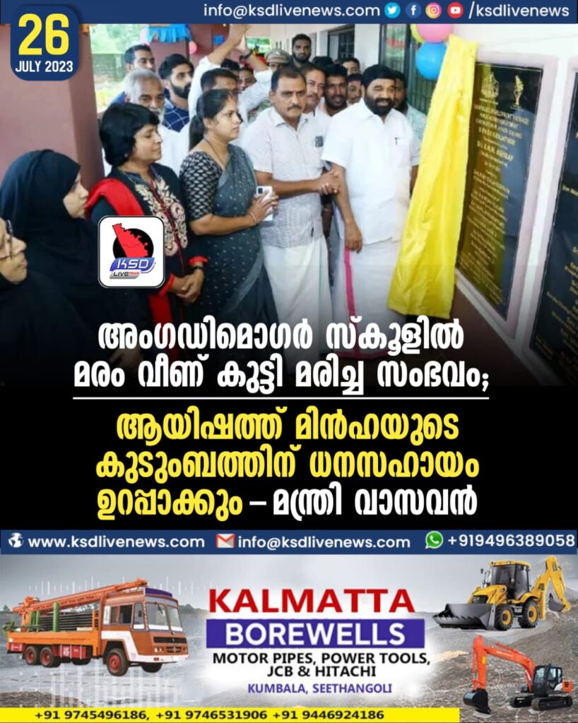 അംഗഡിമൊഗർ സ്കൂളിൽ മരം വീണ് കുട്ടി മരിച്ച സംഭവം; ആയിഷത്ത് മിന്‍ഹയുടെ കുടുംബത്തിന് ധനസഹായം ഉറപ്പാക്കും –മന്ത്രി വാസവൻ
