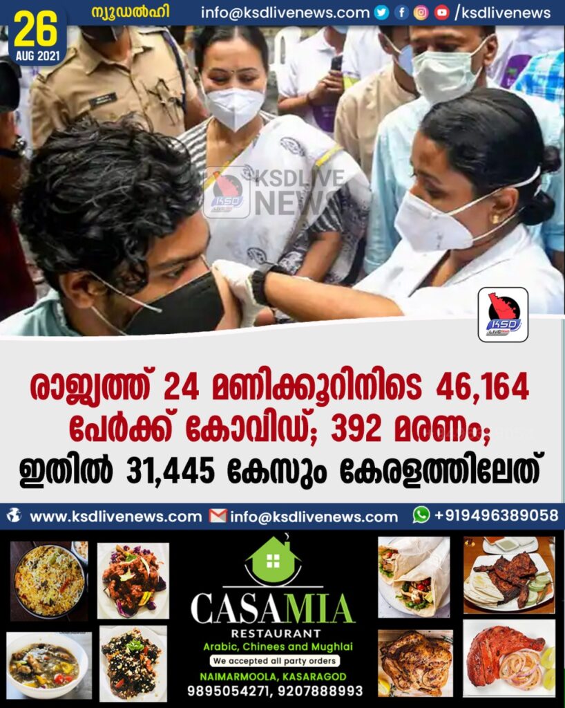 രാജ്യത്ത് 24 മണിക്കൂറിനിടെ 46,164 പേർക്ക് കോവിഡ്; 392 മരണം; ഇതിൽ 31,445 കേസും കേരളത്തിലേത്