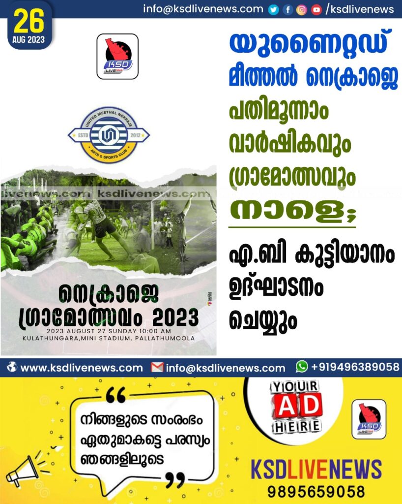 മീത്തൽ നെക്രാജെ: യുണൈറ്റഡ് മീത്തൽ നെക്രാജെ ആർട്സ് ആൻഡ് സ്പോർട്സ് ക്ലബ്ബിൻറെ പതിമൂന്നാം വാർഷികവും ഗ്രാമോത്സവവും 27 തീയതി ഞായറാഴ്ച പള്ളത്ത് മൂല കുളത്തിൻകര ഗ്രൗണ്ടിൽ വെച്ച് നടക്കുകയാണ്. പരിപാടി A B കുട്ടിയാനം ഉദ്ഘാടനം ചെയ്യും.