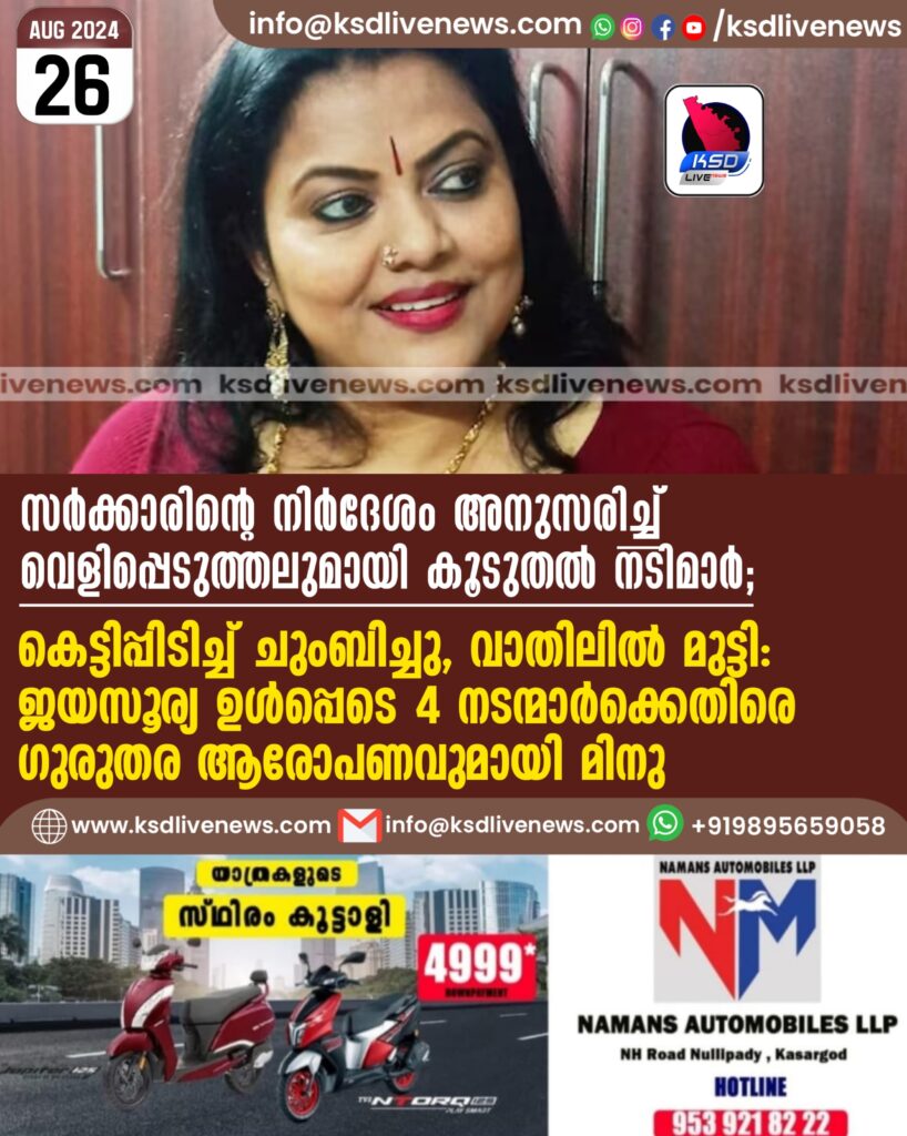 സർക്കാരിന്റെ നിർദേശം അനുസരിച്ച് വെളിപ്പെടുത്തലുമായി കൂടുതൽ നടിമാർ; കെട്ടിപ്പിടിച്ച് ചുംബിച്ചു, വാതിലിൽ മുട്ടി’: ജയസൂര്യ ഉൾപ്പെടെ 4 നടന്മാർക്കെതിരെ ഗുരുതര ആരോപണവുമായി മിനു