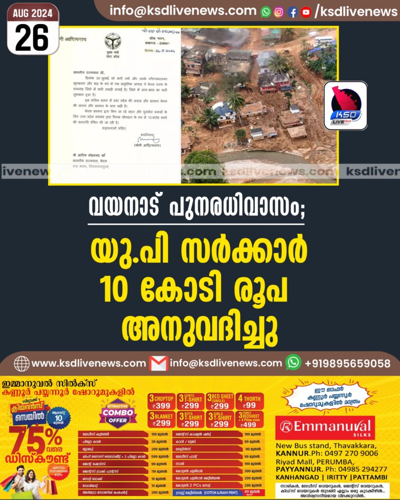 വയനാട് പുനരധിവാസം; യു.പി സർക്കാർ 10 കോടി രൂപ അനുവദിച്ചു