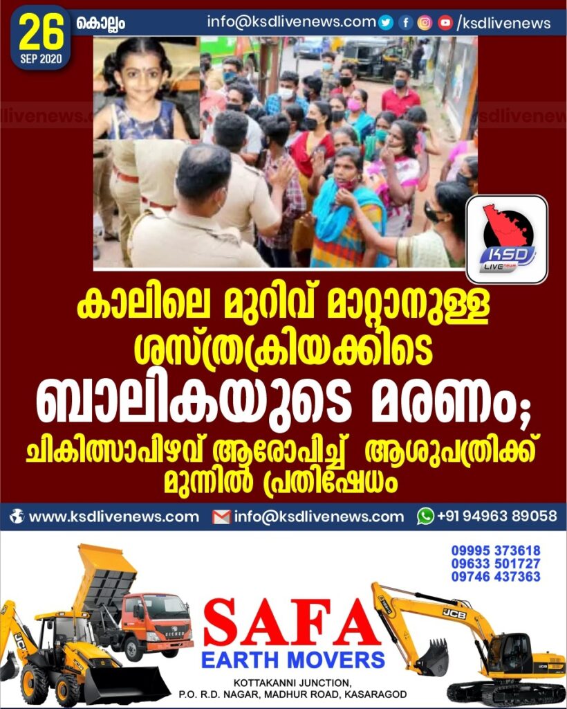 കൊ​ല്ലം: കാ​ലി​ലെ വ​ള​വ് മാ​റ്റാ​നു​ള്ള ശ​സ്ത്ര​ക്രി​യ​ക്കി​ടെ ഏ​ഴ്​ വ​യ​സ്സു​കാ​രി മ​രി​ച്ച സം​ഭ​വ​ത്തി​ല്‍ ചി​കി​ത്സാ​പി​ഴ​വ് ആ​രോ​പി​ച്ച്‌ കു​ട്ടി​യു​ടെ ബ​ന്ധു​ക്ക​ളും നാ​ട്ടു​കാ​രും ആ​ശു​പ​ത്രി​ക്ക് മു​ന്നി​ല്‍ പ്ര​തി​ഷേ​ധി​ച്ചു. സ്ത്രീ​ക​ള്‍ ഉ​ള്‍​പ്പെ​ടെ ഉ​ള്ള​വ​രെ പൊ​ലീ​സ് ബ​ലം പ്ര​യോ​ഗി​ച്ച്‌ അ​റ​സ്​​റ്റ്​ ചെ​യ്താ​ണ് നീ​ക്കി​യ​ത്.