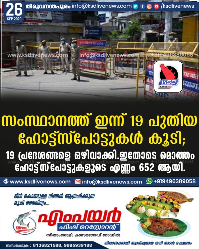 സംസ്ഥാനത്ത് ഇന്ന് 19 പുതിയ ഹോട്ട്സ്പോട്ടുകള് കൂടി; 19 പ്രദേശങ്ങളെ ഒഴിവാക്കി.ഇതോടെ മൊത്തം ഹോട്ട്സ്പോട്ടുകളുടെ എണ്ണം 652 ആയി.
