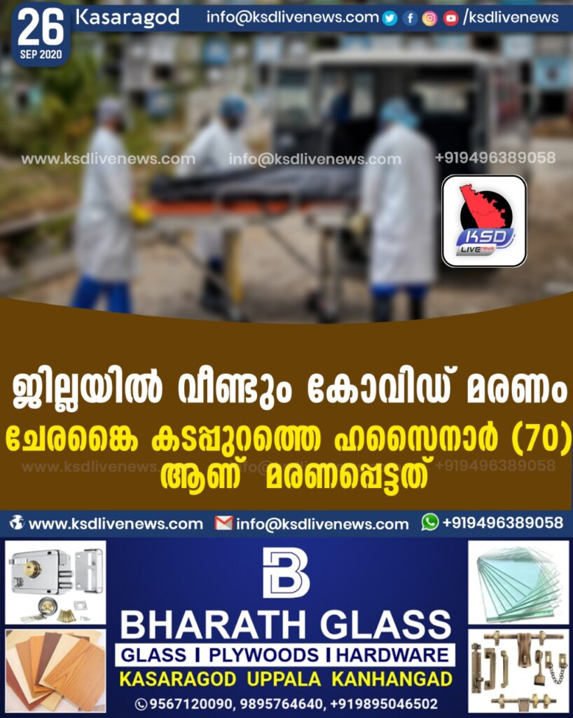 ജില്ലയില് വീണ്ടും കോവിഡ് മരണംചേരങ്കൈ കടപ്പുറത്തെ ഹസൈനാര് (70) ആണ് മരണപ്പെട്ടത്SHARE THIS ONകാസര്കോട്: കോവിഡ് ബാധിച്ച് ചികിത്സയിലായിരുന്ന ഒരാള് കൂടി മരിച്ചു. ചേരങ്കൈ കടപ്പുറത്തെ ഹസൈനാര് (70) ആണ് ഇന്നുച്ചയോടെ മരണപ്പെട്ടത്. ഭാര്യ: സഫിയ. മക്കള്: ഹനീഫ, ജാഫര്, സലാം, സത്താര്, നാബി, ബുഷ്റ, ഫൗസിയ, റൈഹാന, ഷംസി.