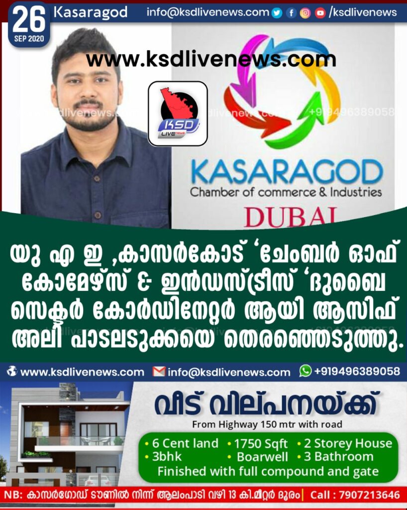 യു എ ഇ , കാസർകോട് ” ചേംബർ ഓഫ് . കോമേഴ്സ് & ഇൻഡസ്ട്രീസ് ” ദുബൈ സെക്ടർ കോർഡിനേറ്റർ ആയി ആസിഫ് അലി പാടലടുക്കയെ തെരഞ്ഞെടുത്തു .